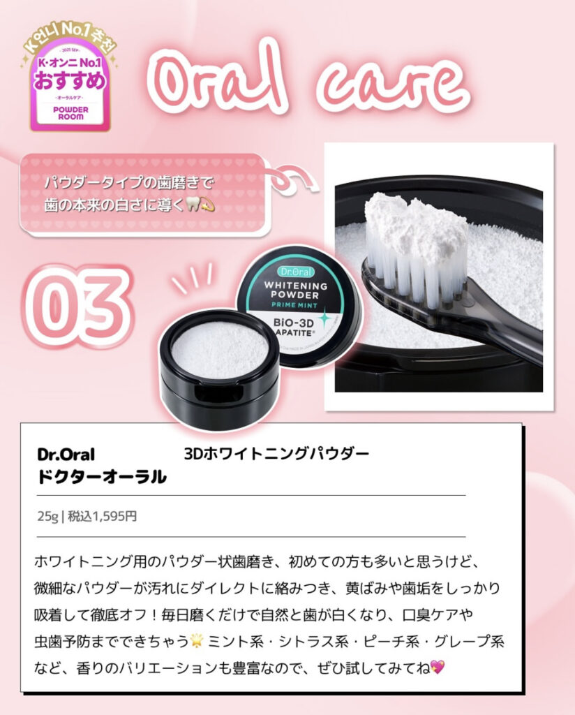 Dr.Oral(ドクターオーラル)3Dホワイトニングパウダーが、韓国最大級のビューティープラットフォーム『POWDER ROOM』が厳選した、いま注目のアイテムとして、『K・オンニおすすめ』オーラルケア部門の1位を獲得しました!!粉ハミガキでは日本初の受賞となります!