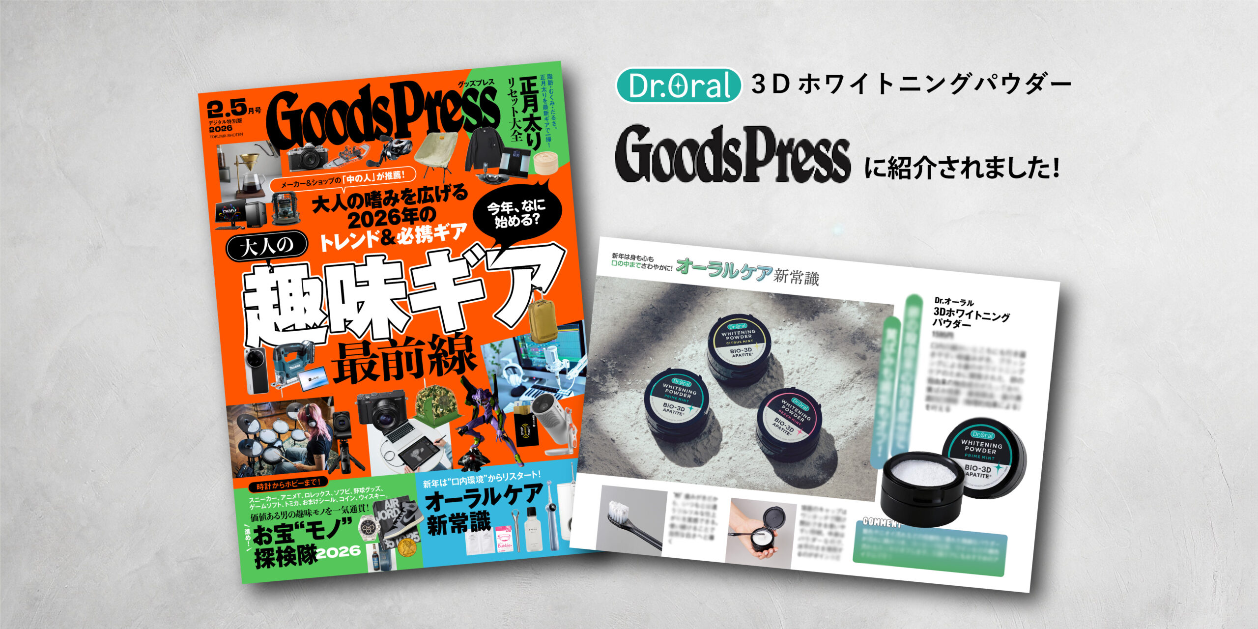 月刊誌「GoodsPress2026年2.5月号(電子版)」の特集『オーラルケア新常識』に、Dr.Oral(ドクターオーラル)3Dホワイトニングパウダーが紹介されました!